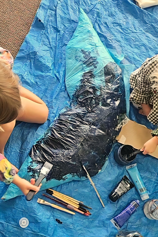 “We had all these recycled magazines, and we thought, why not make a whale? It’s been a true collaboration—mums and teens have helped with construction, and the kids have added their own sea creatures to decorate around it.”